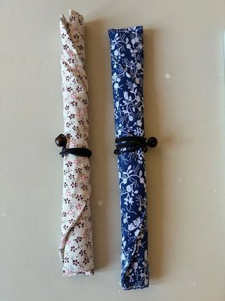 Set di bacchette cinesi con involucro decorato e due piattini. - Involucro per bacchette con fantasia floreale. - Piattini in plastica con decorazione. - Set da due piattini (diametro circa 7 cm).