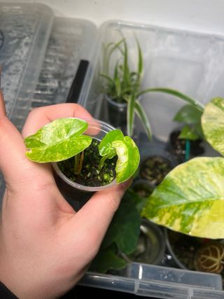 Pianta di Alocasia Gageana Aurea con foglie variegate. Cormi disponibili 3 che saranno venduti per il prezzo indicato singolarmente - Foglie con screziature verdi e gialle. - Crescita vigorosa.