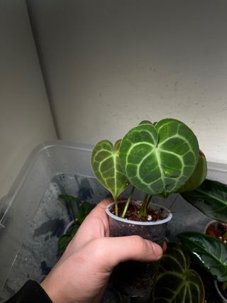 Anthurium Dark Crystallinum con foglie scure e venature argentate. Cloni fatti da una buona pianta madre che presenta foglie più spesse rispetto al solito - Foglie grandi e vellutate. - Venature contrastanti. - Pianta da interno.