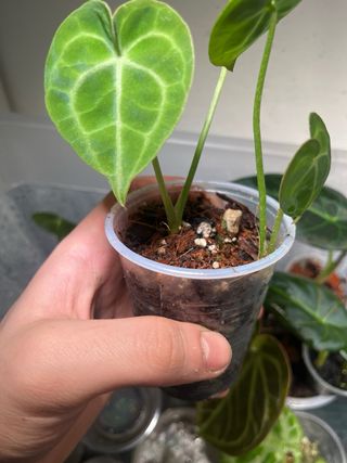 Pianta di Anthurium Clarinervium con foglie a forma di cuore e venature evidenti. Ogni vasetto ha 2 piantine - Foglie verdi scuro con venature argentate. - Crescita in vaso trasparente.