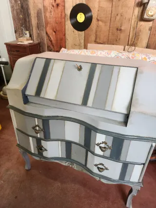 Bellissima ribaltina in stile vintage, restaurata con cura. Un pezzo unico che aggiunge carattere a ogni ambiente. - Design a righe grigie e bianche. - Dettagli in metallo dorato sui cassetti e sulla ribaltina. - Gambe eleganti e sinuose.