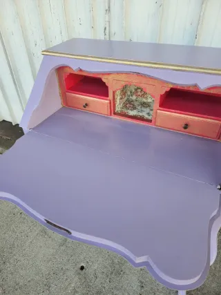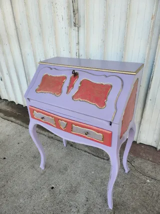 Scrittoio e ribaltina restaurato in stile Gipsy Chic. - Dettagli decorativi in rilievo color corallo. - Bordi dorati. - Gambe curve eleganti.cassetti rivestititicl con carta floreale Sottoposto a trattamento antitarlo e levigato, dipinto con prodotti di altissima qualita'.