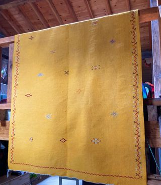 tappeto portato dal Marocco meno di un anno fa giallo (non pollo) Ha simboli berberi? buon materiale e buona qualità Ha una macchia bianca (vista nell'ultima foto), è fatta di cera di candela. Può essere rimossa. misure: 150x250 (rettangolare)