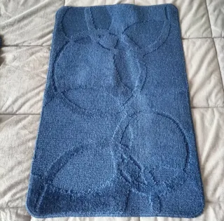 Set di due tappeti da bagno di colore blu, con un motivo a cerchi intrecciati. - Dimensioni: 80x50 cm ciascuno. - Design moderno e accattivante. - Morbidi al tatto. - Tessuto spesso. - Gomma antiscivolo. - Per bagno, cucina, ingresso. - Multiuso. - Lavabile in lavatrice.