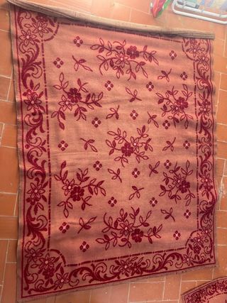 Set di tappeti tessuti a mano, ideali per arredare la tua casa. Ci sono sei pezzi in totale: due singoli grandi, due singoli piccoli, un tappeto rettangolare e un runner da tavola. I colori sono rosso e verde, con dettagli decorativi. Sono in buone condizioni, pronte all'uso.