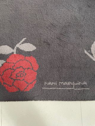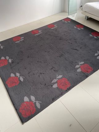 Tappeto di grandi dimensioni con un distintivo design floreale. Misure: 2 x 2,5 metri. Design di fiori rossi su sfondo grigio.