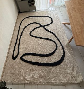 Tappeto di grandi dimensioni con un design moderno e accattivante. - Dimensioni: 160x230 cm. - Motivo astratto in bianco e nero. - Texture piacevole al tatto. Utilizzo di 1 anno. Al momento dell'acquisto, lo ritiriamo. È appena stato lavato.