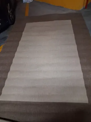 Tappeto di tela di grandi dimensioni con un design a due tonalità. Dimensioni 2,00 m x 3,00 m. Presenta quelle ondulazioni perché era arrotolato. Colore principale: beige. Bordo esterno: marrone.