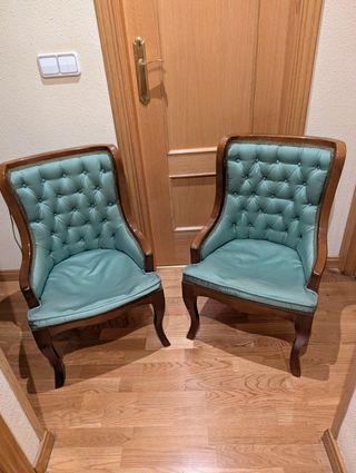 Due poltrone/poltroncine da 1 posto ciascuna. In pelle, belle, antiche, ma in perfette condizioni. Vintage. Vendo vari mobili antichi: letti, comodini, sedie, tavoli, divani, decorazioni e molto altro. Ávila capitale (zona sud - quartiere Toledana). Per il soggiorno, ufficio, studio, camera, stanza, sala, seconda residenza, casa/appartamento in affitto, ecc.