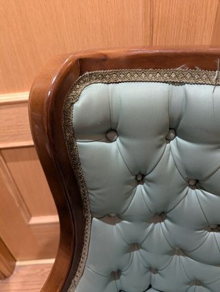 Vendo splendida coppia di poltroncine in stile classico, ideali per arricchire un salotto, una camera da letto o un angolo lettura con un tocco di eleganza e storia. Caratteristiche Principali: Struttura: Solida struttura in legno scuro Rivestimento: Seduta e schienale imbottiti con elegante tessuto damascato (o broccato) nel colore azzurro carta da zucchero / grigio chiaro perlato. Il tessuto presenta una trama operata molto raffinata. Condizioni: Estetiche: Le poltroncine sono in buone condizioni generali e pronte per l'uso immediato. La struttura in legno è robusta. Ideali anche per un progetto di restauro o un relooki