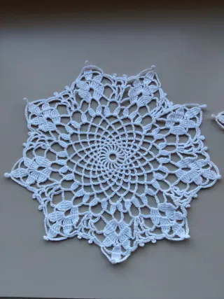 Set di otto tappeti all'uncinetto fatti a mano. Ogni tappeto presenta un design intricato e delicato, perfetto per aggiungere un tocco artigianale a qualsiasi spazio. - Design floreale. - Finitura bianca. - Realizzati in cotone.