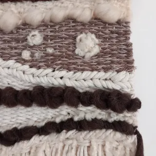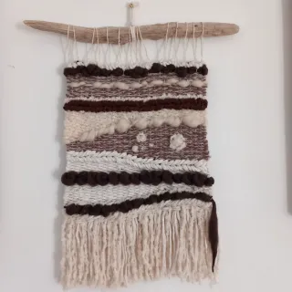 Bellissimo arazzo tessile realizzato a mano, perfetto per decorare le pareti. - Realizzato con filati di lana merino e cotone. - Appeso a un pezzo di legno naturale. - Motivo a righe con diverse texture.