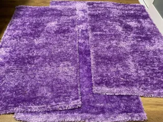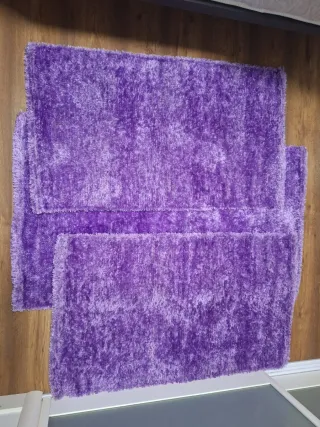 Set di tre tappeti morbidi e accoglienti. Materiale 60% poliestere e 40% cotone. Texture soffice. Design moderno. Misure: 1 tappeto da 120x70 cm e 2 tappeti da 100x60 cm. Colore lilla/viola. Nuovi, mai usati.