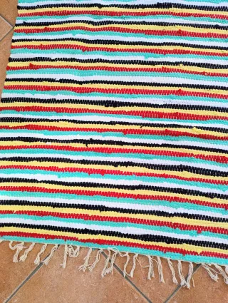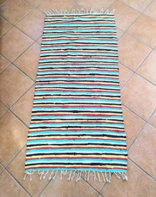 Tappeto scendiletto realizzato a mano ,100% cotone. Misure in foto. Nuovo mai utilizzato. - Realizzato in cotone. - Design a strisce vivaci. - Finitura con frange.