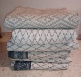 Set di cinque tappeti in cotone con un design geometrico in tonalità beige e grigio. Prezzo nuovo, 48€ ciascuno. Li vendo a 48€ per l'intero lotto (9,50€ ciascuno). Si puliscono facilmente con aspirapolvere o pulitore a vapore. TRUCCO: ACQUISTA IL LOTTO, TI FERMI CON QUELLI CHE VUOI E VENDINE ALTRI PER OTTENERE UN RISPARMIO