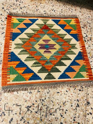 Bellissimo tappeto Kilim fatto a mano, proveniente dall'Afghanistan. Un pezzo unico che aggiunge calore e colore alla tua casa. - Design geometrico tradizionale. - Dimensioni: 47x47 cm.