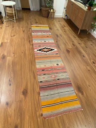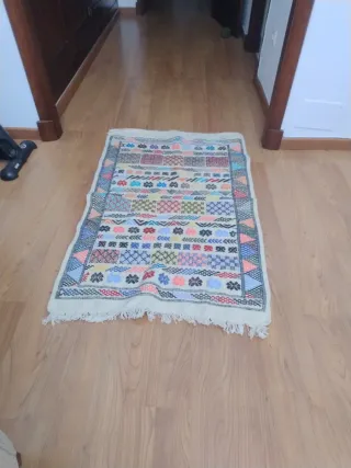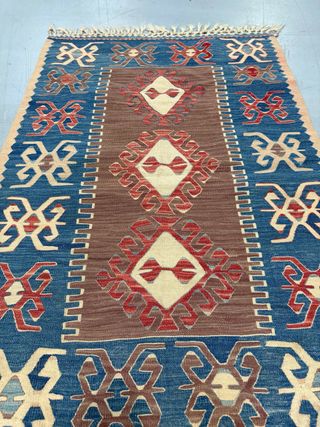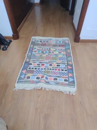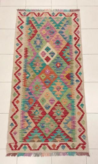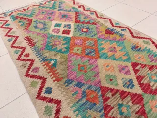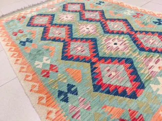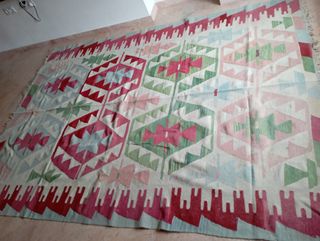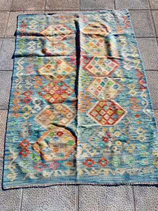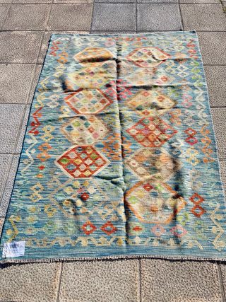 Tappeto kilim artigianale. Il tappeto è in ottime condizioni, presenta qualche lieve sfumatura nel colore. Il tappeto è lavato e pronto all'uso. Dimensioni 200x121. Sono disponibile ad inviare il video del tappeto su richiesta per visualizzare meglio dettagli colori e condizioni.