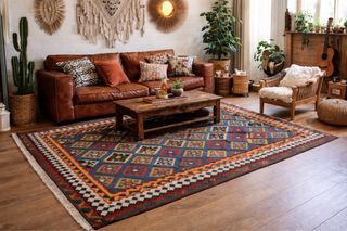 Tappeto in stile kilim con un design vibrante e dettagliato. Aggiunge un tocco di colore e tradizione a qualsiasi spazio. - Design geometrico e floreale. - Prevalenza di toni rossi e multicolori. - Texture in tessuto.