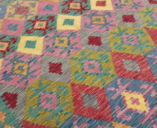 Tappeto Kilim afgano con un design geometrico e colorato. Le sue dimensioni sono 235x178 cm. - Motivo a rombi. - Bordi con decorazione a zig-zag. - Nuovo