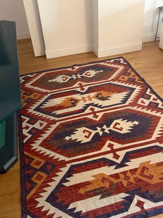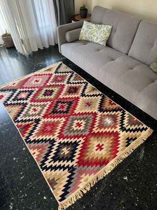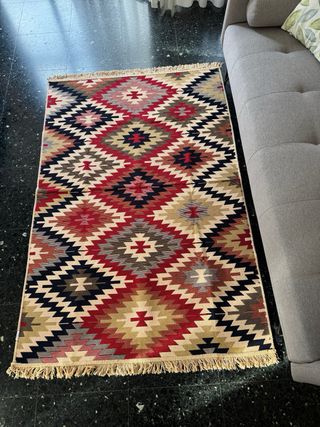 Vendo splendido tappeto in stile Kilim acquistato da Zara Home. È in lana, con uno spettacolare design geometrico in tonalità terra, tegola, blu navy e beige. Aggiunge molta calda e stile a qualsiasi soggiorno o camera da letto. Caratteristiche: Materiale: Lana (tipo Kilim). Prezzo originale: Mi è costato 290€. Stato: È in perfetto stato di conservazione. Ha qualche piccolo dettaglio superficiale dovuto all'uso quotidiano che si elimina perfettamente lavandolo, per il resto è impeccabile.