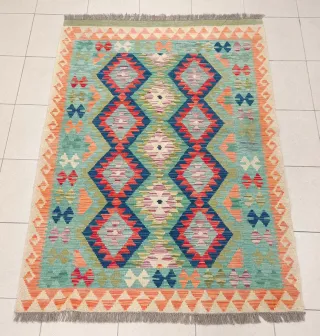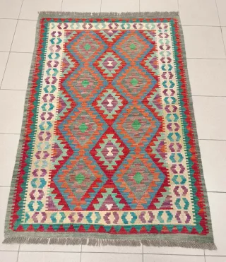 Tappeto Kilim afgano fatto a mano, con un design geometrico vivace. Le sue dimensioni sono 152x107 cm. - Realizzato in lana. - Motivo a rombi in colori vivaci.