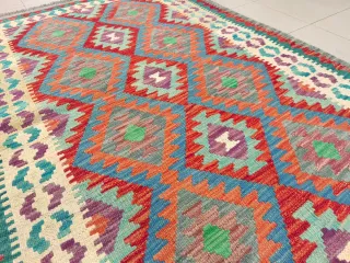 Autentico tappeto Kilim di origine afghana, tessuto a mano con lana. Design geometrico tradizionale. Tonalità vibranti che aggiungono calore. Texture unica del tessuto Kilim. Dimensioni: 1,74 x 1,25. In perfette condizioni, ma NECESSITA DI PULIZIA!