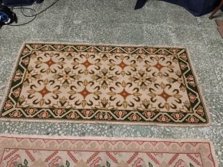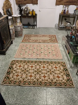 Tappeti portoghesi di Arraiolos. Realizzati a mano con design floreale e molti dettagli. Frange su tutto il perimetro. Dimensioni: 164*88cm (verde), 154*98cm (garofano) e 156*87cm (rosa). PREZZO INDIVIDUALE VDV3154 aubusson palaciega antigüedad antiguo nudo spagnolo kilim real fabbrica di arazzi afgana vintage retro classico specchio veneziano obelisco tappeto vintage retro rustico classico becara Borgia Conti hanbel valenti midcentury allungato stretto iraniano persiano tabriz zara kave home sklum Jansen cartuja asta stuyck artigianale art nouveau deco modernismo catalano bagues vitra cesca figura scultura tela bambù