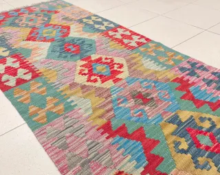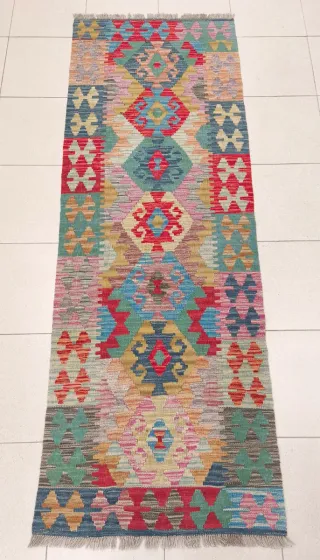 Tappeto Kilim afgano fatto a mano, con un design tradizionale e vibrante. Le sue dimensioni sono 183x66 cm. - Motivi geometrici tipici. - Trama fitta e resistente. - Nuovo