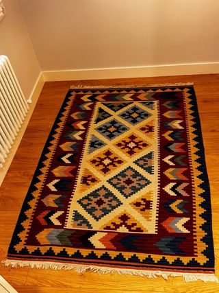 Pezzo unico di Kilim. Dimensioni: 104x154 cm. Tappeto kilim che si distingue per originalità, stile e calore. Aggiunge un tocco unico e originale alla casa, migliorando la decorazione e non passando inosservato. Composizione: 100% lana lavorata a mano. GUARDA IL MIO PROFILO, HO ALTRI OGGETTI DECORATIVI TUTTI NUOVI. LEROY MERLIN, ZARA HOME, MAISON DU MONDE, IKEA, ARTIGIANALE, LANA, ORIENTAL.