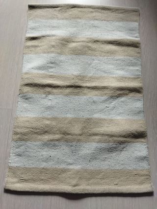 Tappeto in stile Kilim con un design a righe nei toni del beige e dell'avorio. Dimensioni: 60x90cm. 100% cotone de El Corte Ingles. Qualità eccellente. Usato 2 volte. Questo tappeto si adatta a qualsiasi ambiente e può essere lavato in lavatrice.