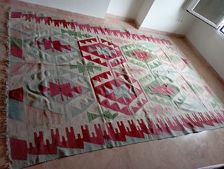 Kilim di 280 x 205 cm. Fondo beige con disegni geometrici in rosso, rosa, verde e celeste. Le pieghe visibili nella foto sono dovute al fatto che è rimasto piegato e conservato per mesi, ma dopo alcuni giorni a terra si appiattisce completamente.