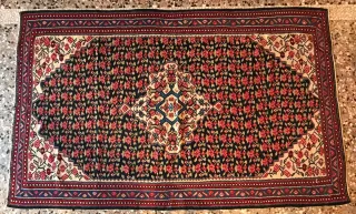 Tappeto in stile Kilim persiano, tipo Sumagh, con un design geometrico intricato. Molto antico, in ottime condizioni, acquistato all'estero. Gli estremi sono stati rinforzati dai restauratori del negozio per evitare che i nodi si sfilaccino. Misura 1,09 X 1,52. - Tessuto artigianale. - Motivi geometrici tradizionali. - Texture distintiva del tessuto Sumagh.