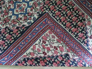 Tappeto Kilim Persia Senneh inizio XX sec. lana tinta con pigmenti vegetali e minerali cm. 223x169 Il contrasto dei colori mette in risalto le caratteristiche di questo tappeto. Al centro campeggia una losanga contornata da piccoli mazzolini di rose, mentre le tre cornici sono formate da susseguirsi di motivi floreali stilizzati di vari colori.