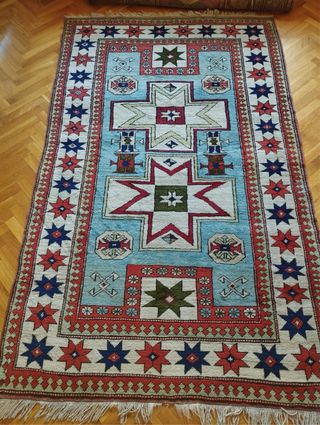 Prestigioso e antico kilim karabagh, autentico, recentemente restaurato (vedi foto), lavato e trattato (giugno 2024). Il certificato di garanzia contiene le misure del tappeto e la provenienza.