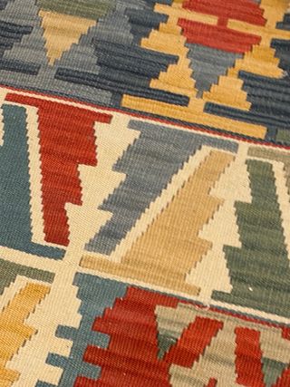 Tappeto in stile kilim con un accattivante design geometrico. Aggiunge un tocco di colore e texture alla tua casa. Realizzato in lana, con colori principali blu e rosso, presenta un design a rombi e dettagli geometrici.
