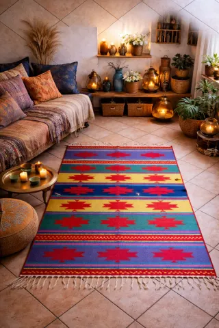 Tappetino persiano orientale decorativo 58x45 cm – stile boho Perfetto per angoli lettura, tavolini, ingressi o come decorazione da parete. Realizzato con motivo centrale a stella blu e beige su sfondo rosso borgogna, bordi floreali beige e neri su fondo blu. Frange intrecciate alle estremità, tessitura simmetrica e dettagli curati. Si abbina perfettamente a uno stile boho, etnico o naturale. La prima foto mostra un tappeto simile per trarre ispirazione di arredamento