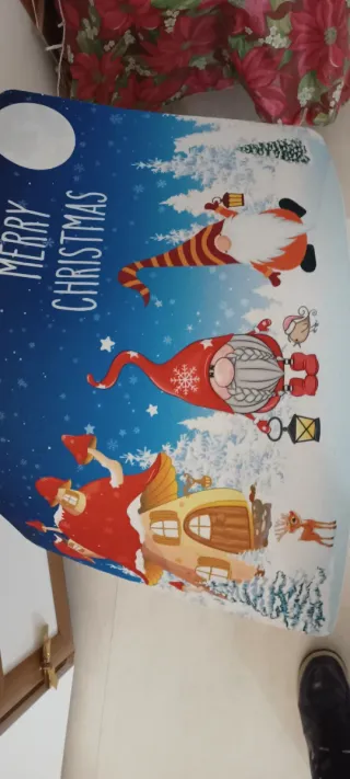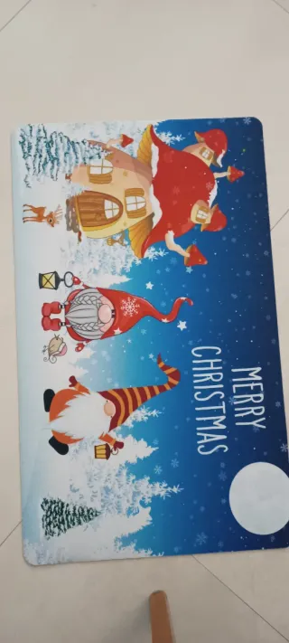 Tappeto decorativo a tema natalizio con simpatici gnomi e fiocchi di neve. Perfetto per aggiungere un tocco festivo alla tua casa. Misura 75*45 cm. - Design con gnomi e alberi innevati. - Sfondo blu con neve stilizzata. - Scritta Merry Christmas.