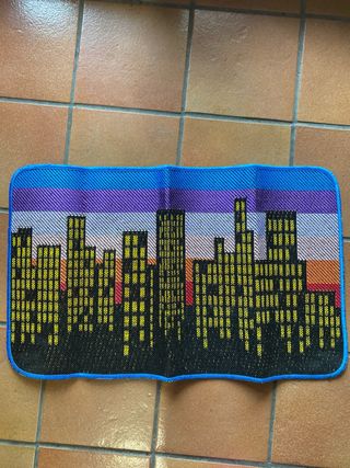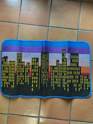 Tappetino con stampa di uno skyline cittadino. Presenta un design vivace e colorato. - 78x47 cm - Stampa dettagliata di una città. - Bordi in tessuto blu.