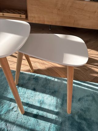 Set di tavoli per il salotto con un design moderno ed elegante. Perfette per completare il tuo spazio. - Pannelli in legno laccato bianco. - Gambe in legno curvato. - Design organico e minimalista. Una delle tavole con dettaglio nella foto (danneggiata)