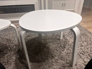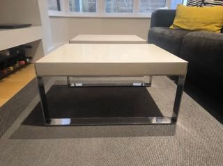 2 eleganti tavoli da salotto dal design moderno. - Finitura superiore bianca lucida. - Gambe e dettagli in metallo argentato. Il prezzo è per entrambi, ciascuno 25€. Ritiro a San Sebastián, non effettuo spedizioni.