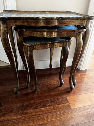 Set di tre tavoli nido con un elegante design in stile fiorentino. Perfetto per aggiungere un tocco classico alla tua casa. Finitura dorata e dettagli in blu. Realizzati in legno.