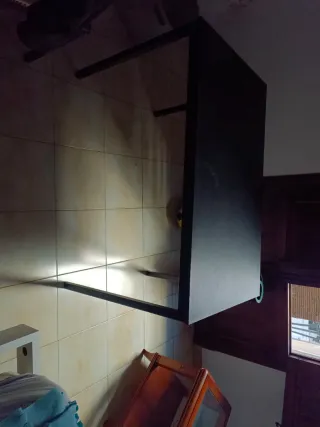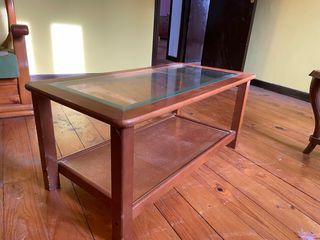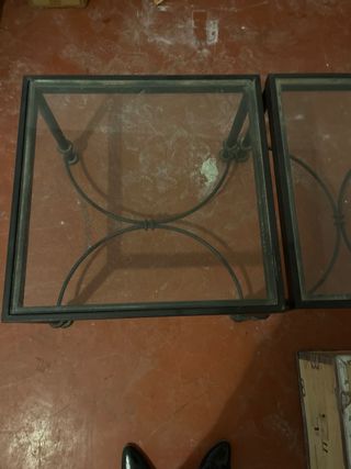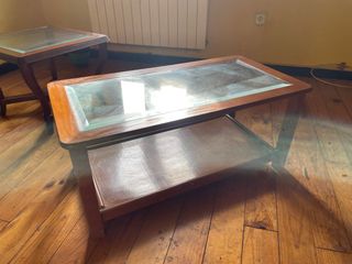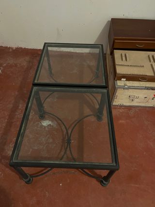 Set di due tavolini con un design elegante. - Struttura in legno. - Superficie in vetro. - Colore marrone e trasparente. Si vendono separatamente 15€ ciascuno, insieme 25€. Dimensioni del grande: 93x48x40. Dimensioni del piccolo quadrato: 58x58x45.