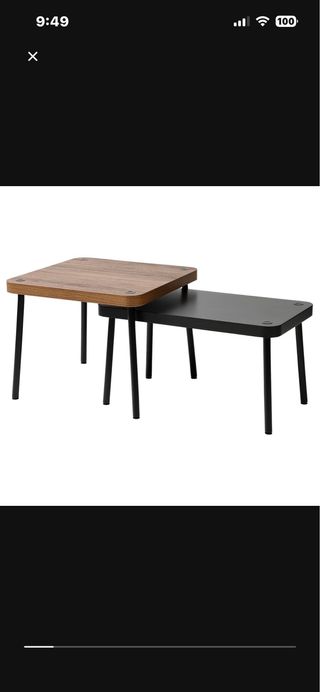 Set di due tavolini con piano in legno massello e struttura in ferro. Piano in legno con venature visibili. Gambe in ferro color nero. (25€ ciascuno)