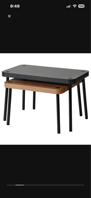 Set di due tavoli da centro impilabili con un design moderno. - Piano superiore in legno con finitura naturale. - Base inferiore in metallo nero. - Gambe metalliche nere.