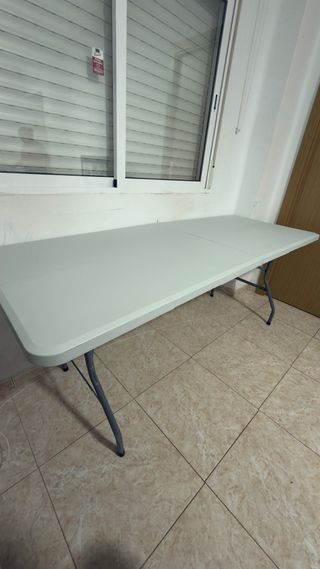 Tavoli pieghevoli in resina con struttura metallica, ideali per eventi o uso esterno. Le dimensioni sono 150 cm di lunghezza e 70 cm di larghezza. Vendo entrambi insieme, uno ha un piccolo urto come si può vedere nella foto, sono nuovi e mai usati. Facili da trasportare. Resistenti alle intemperie.