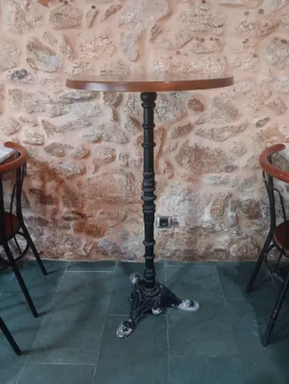 Tavolo alto con un design rustico che combina legno e metallo. La sua struttura gli conferisce un tocco industriale ed elegante. - Piano rotondo in legno. - Base in metallo con un design ornamentale.