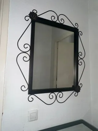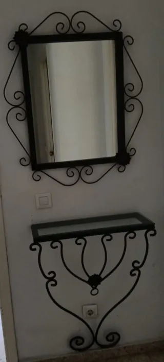 Set di ingresso con specchio e consolle. Struttura in metallo battuto. Piano in cristallo.