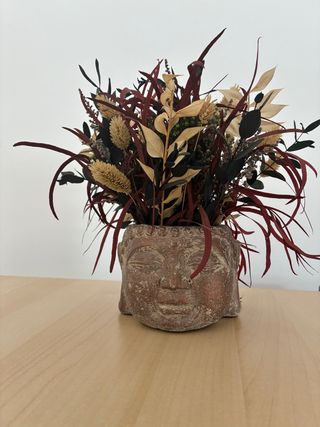 Bellissima composizione floreale con fiori conservati in un vaso a forma di testa di Buddha. Ideale per arredare qualsiasi spazio con un tocco zen ed elegante. - Fiori stabilizzati dai toni rossastri, beige e neri. - Vaso in ceramica a forma di testa di Buddha. - Perfetto per decorare tavoli, mensole o qualsiasi angolo della casa.
