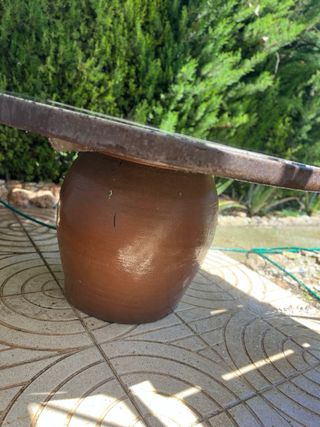Bellissimo tavolo da giardino in marmo con un originale supporto in ceramica botijo. Ideale per dare un tocco rustico ed elegante al tuo spazio esterno. Superficie in marmo grigio con venature bianche. Base in botijo marrone resistente e stabile. Perfetto per patii o terrazze. Ascolto offerte