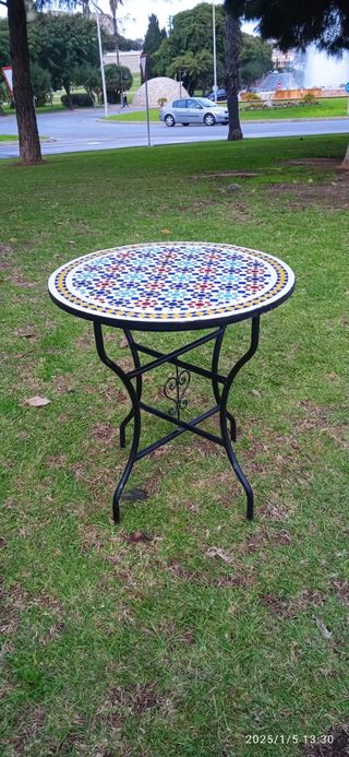Tavolo elegante con un design unico e accattivante, perfetto per dare un tocco speciale al tuo spazio interno ed esterno. - Piano in ceramica con mosaico bianco, blu, verde, rosso vino... - Bordo decorativo con motivi geometrici. - Base in metallo resistente. - Tavolo rotondo nuovo con diametro di 160 cm. - Il supporto in ferro forgiato e il tavolo sono realizzati a mano a Fez secondo le tecniche tradizionali. - Lo zellige è un mosaico di ceramica artigianale e rustica dal bellissimo effetto estetico, ricco di colori. - Realizziamo tavoli a mosaico su misura. - Effettuiamo spedizioni in tutta la penisola.